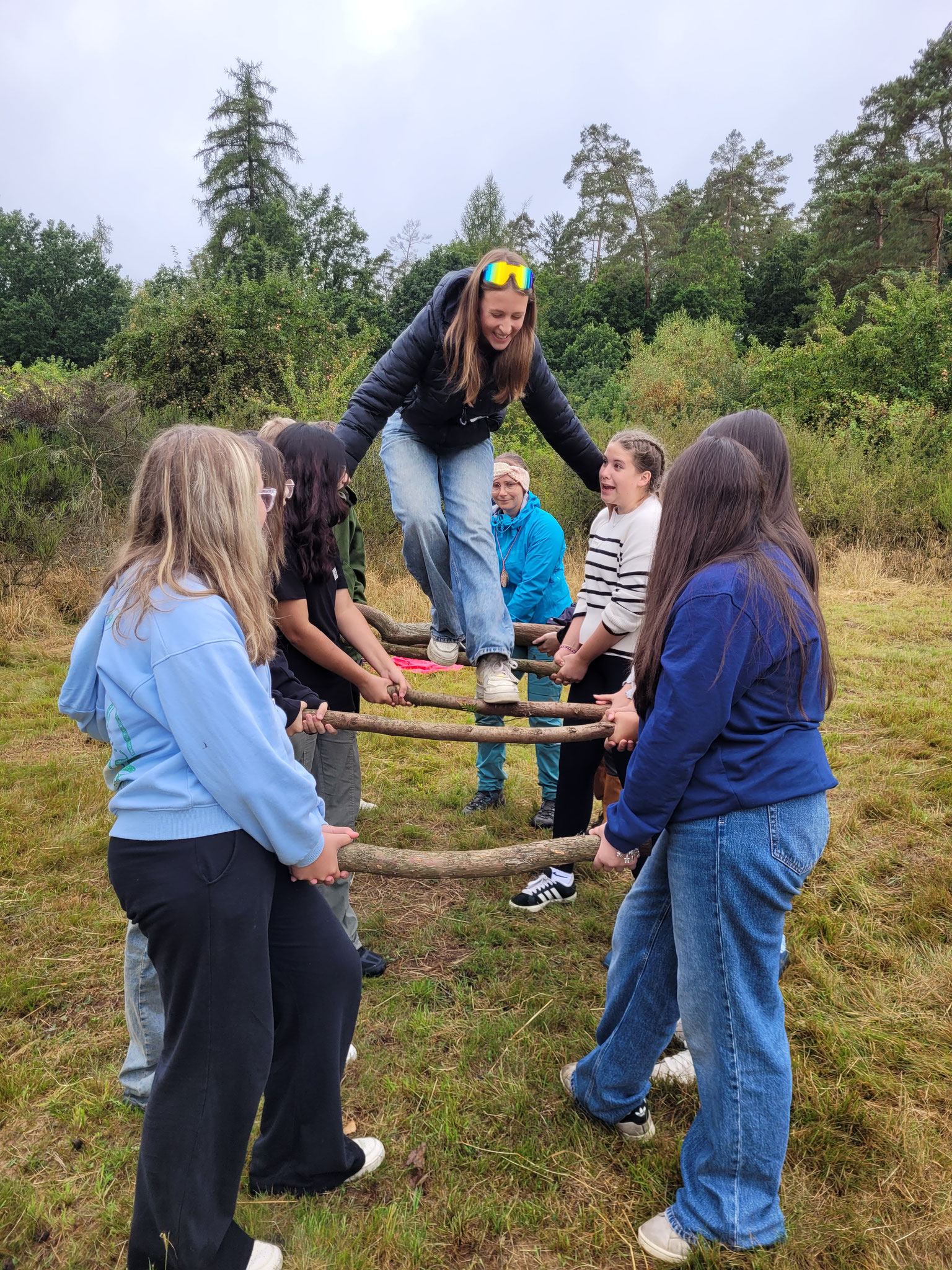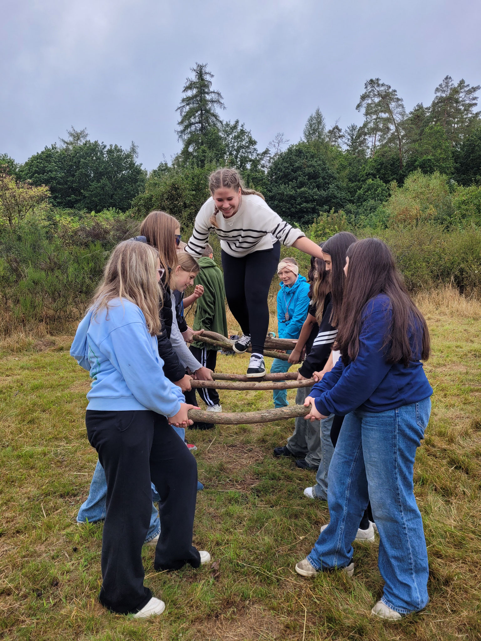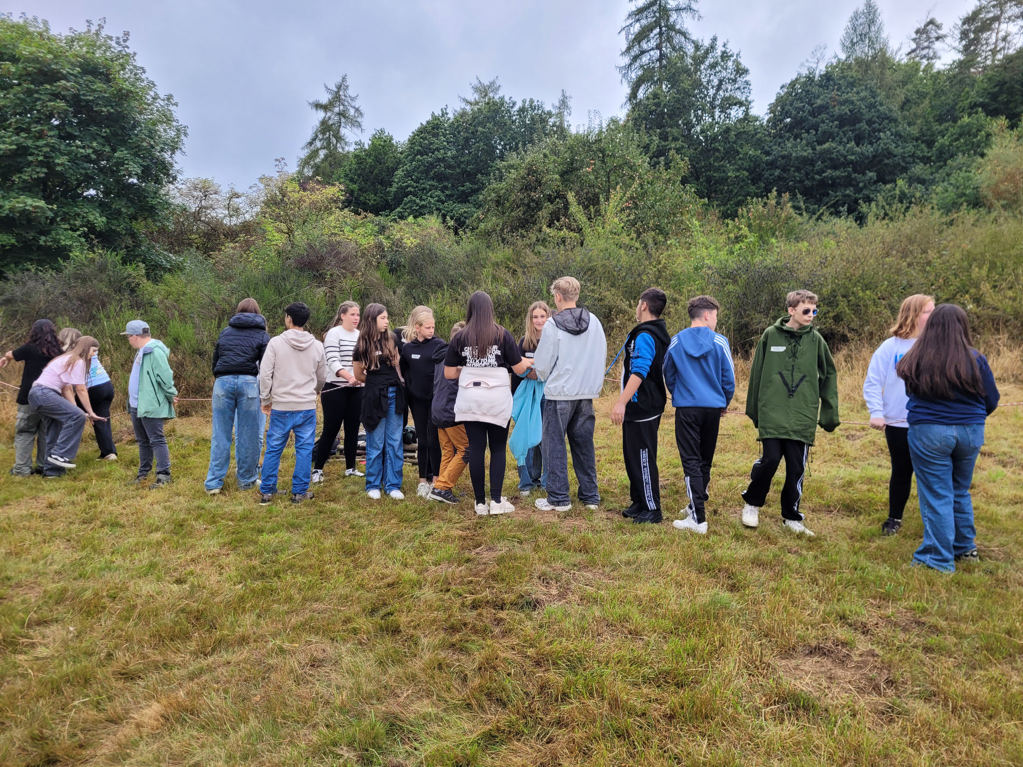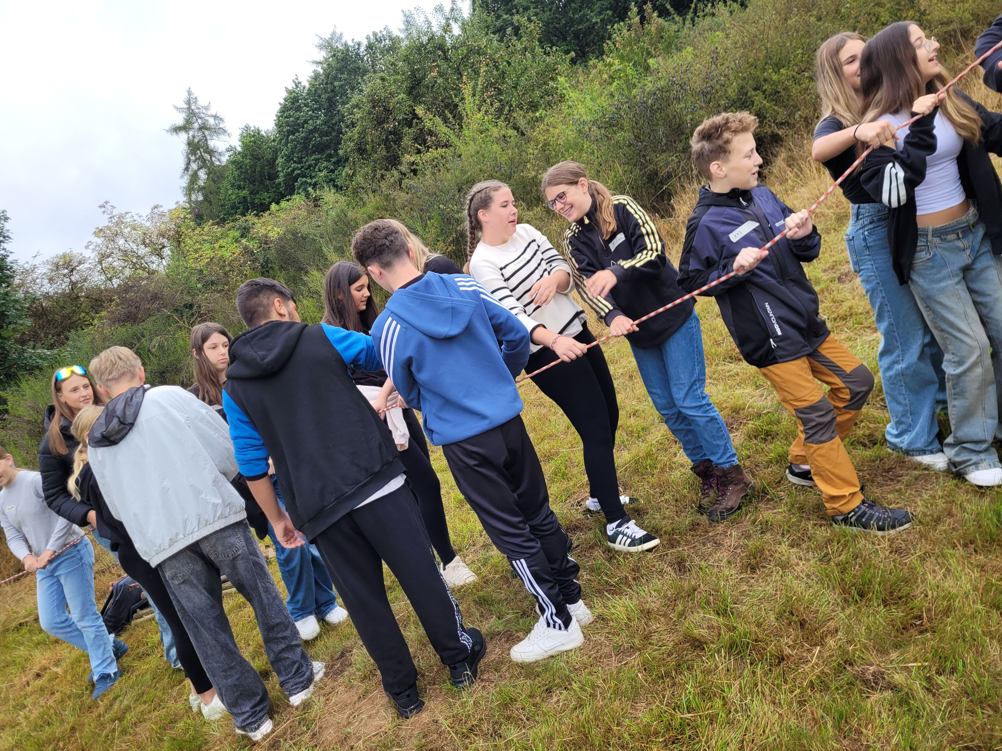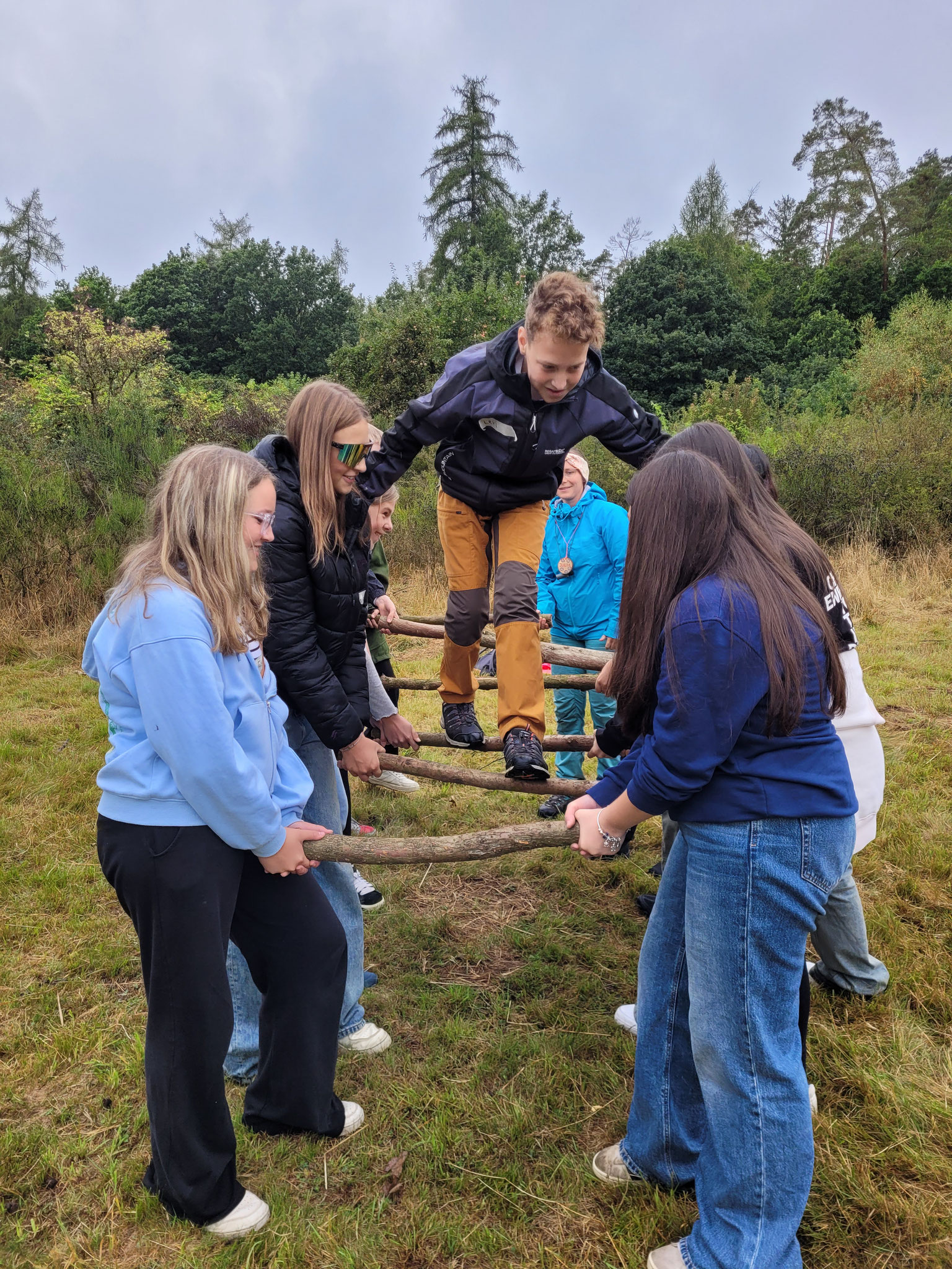 Die Klassen der 8. Jahrgangsstufen nahmen im August und September an drei Tagen zum Thema „Waldpädagogik“ teil. Neben Informationen zur nachhaltigen Bewirtschaftung des Waldes und verschiedenen Baum- und Tierarten, lernten die Schüler auch einiges Wissenswertes über ihre zum Teil neuen Klassenkameraden kennen. So mussten sie sich beispielsweise entlang eines Seils nach ihrem Geburtstag, dem Anfangsbuchstabend des Namens oder auch der Adresse sortieren. Eine Übung, die den Schülern einiges an Mut und Kraft abverlangte, bestand darin, über dicke Äste zu balancieren, die von den Mitschülern hochgehalten wurden. Zum Abschluss wurde dann entweder noch eine Partie Werwolf in der „Holzfäller-Version“ gespielt oder gemeinsam gegrillt.