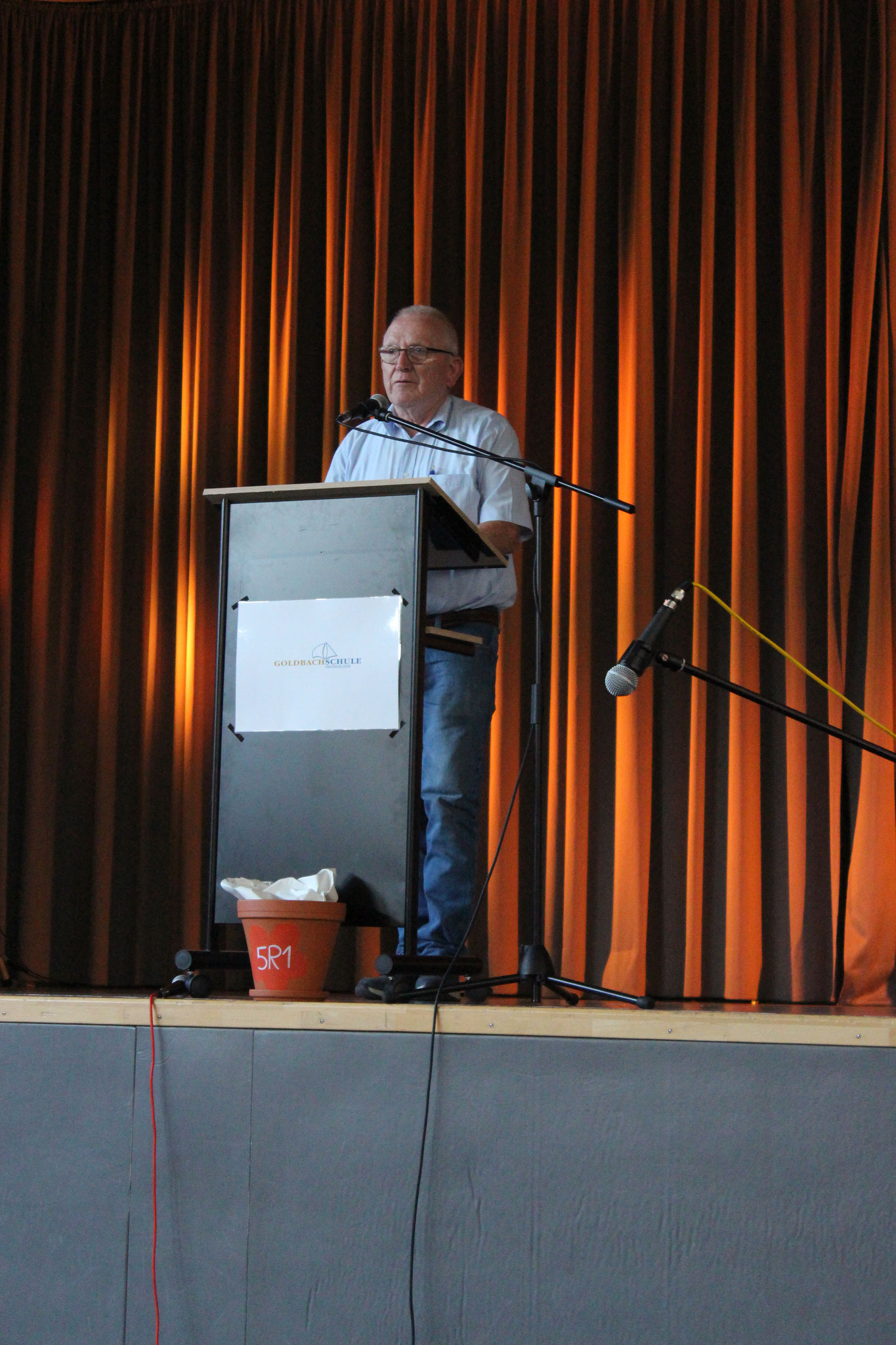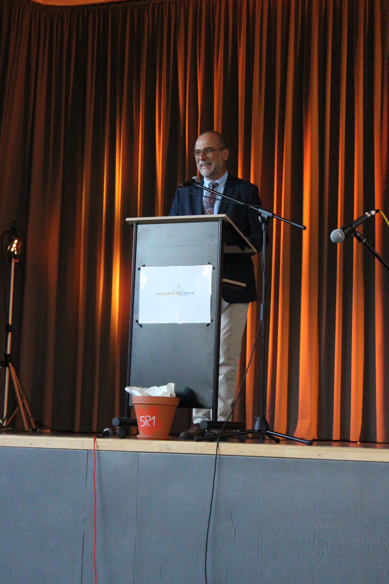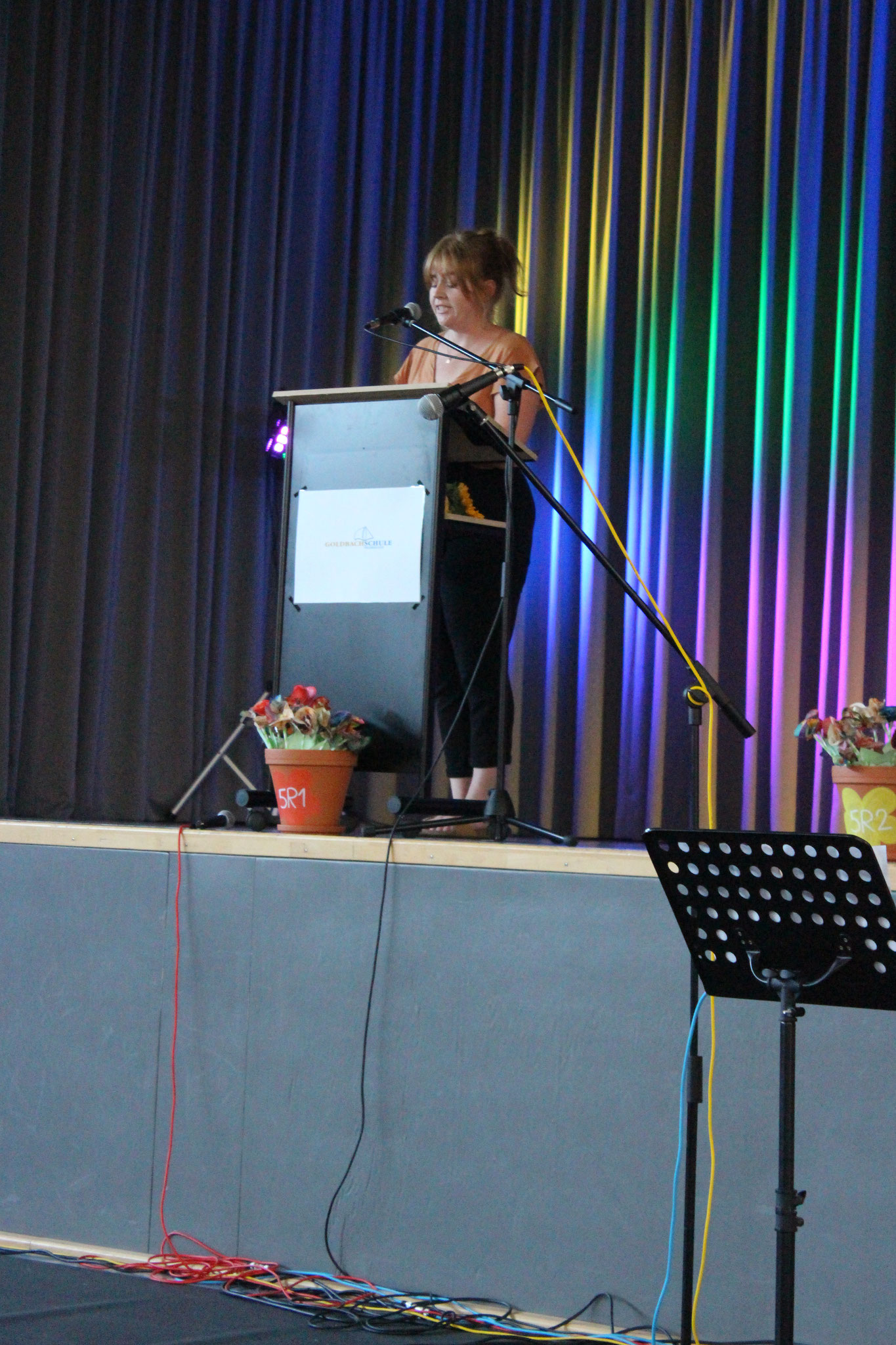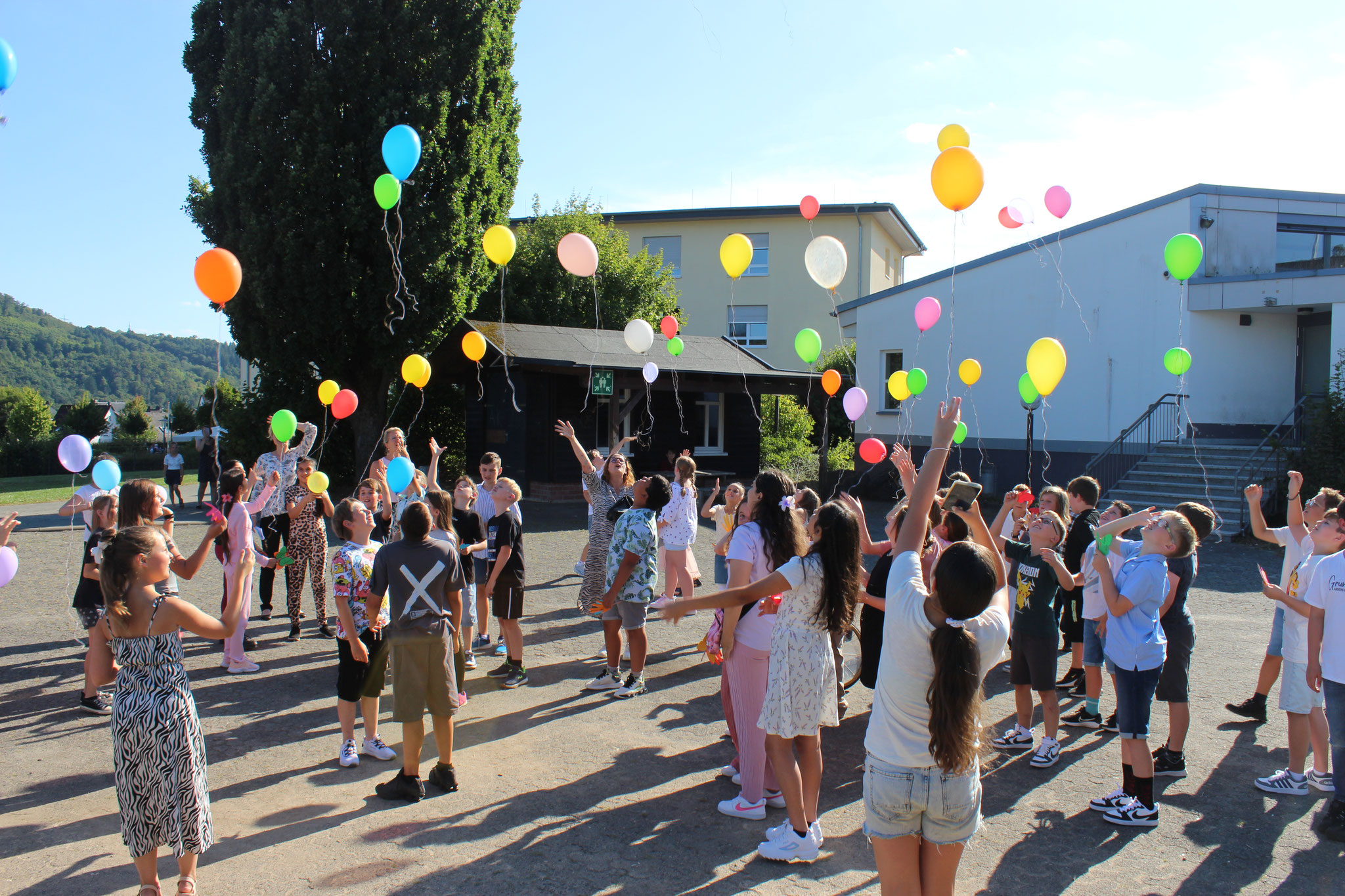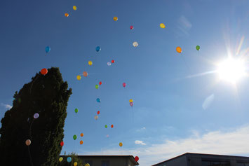 Im Anschluss an die Andacht fand dann die Einschulung der neuen Fünftklässler statt. Schulleiter Andreas Acker begrüßte die Schüler, Eltern, Lehrkräfte und alle anderen Anwesenden herzlich an der Goldbachschule. Roland Metz schloss sich den Worten an und hieß die Schüler und Eltern im Namen des Fördervereins ebenfalls willkommen. Auch in diesem Jahr wurden wieder T-Shirts, Brezel und Infomappen gesponsort. An der Gestaltung der Feierlichkeiten war zudem die jetzige Jahrgangsstufe 6 beteiligt, die ihre neuen Mitschüler mit zwei Liedern und Luftballons empfing. Nach den Beiträgen wurden die Schüler dann von ihrer jeweiligen Klassenlehrerin einzeln nach vorne gerufen, um die Geschenke des Fördervereins zu erhalten. Bevor die Schüler zum ersten Mal mit ihren Mitschülern und Klassenlehrerinnen Frau Stertz (5H), Frau Dreyße (5R1) und Frau Jost (5R2) in ihre jeweiligen Räume gegangen sind, haben alle gemeinsam auf dem Schulhof Luftballons steigen lassen.
