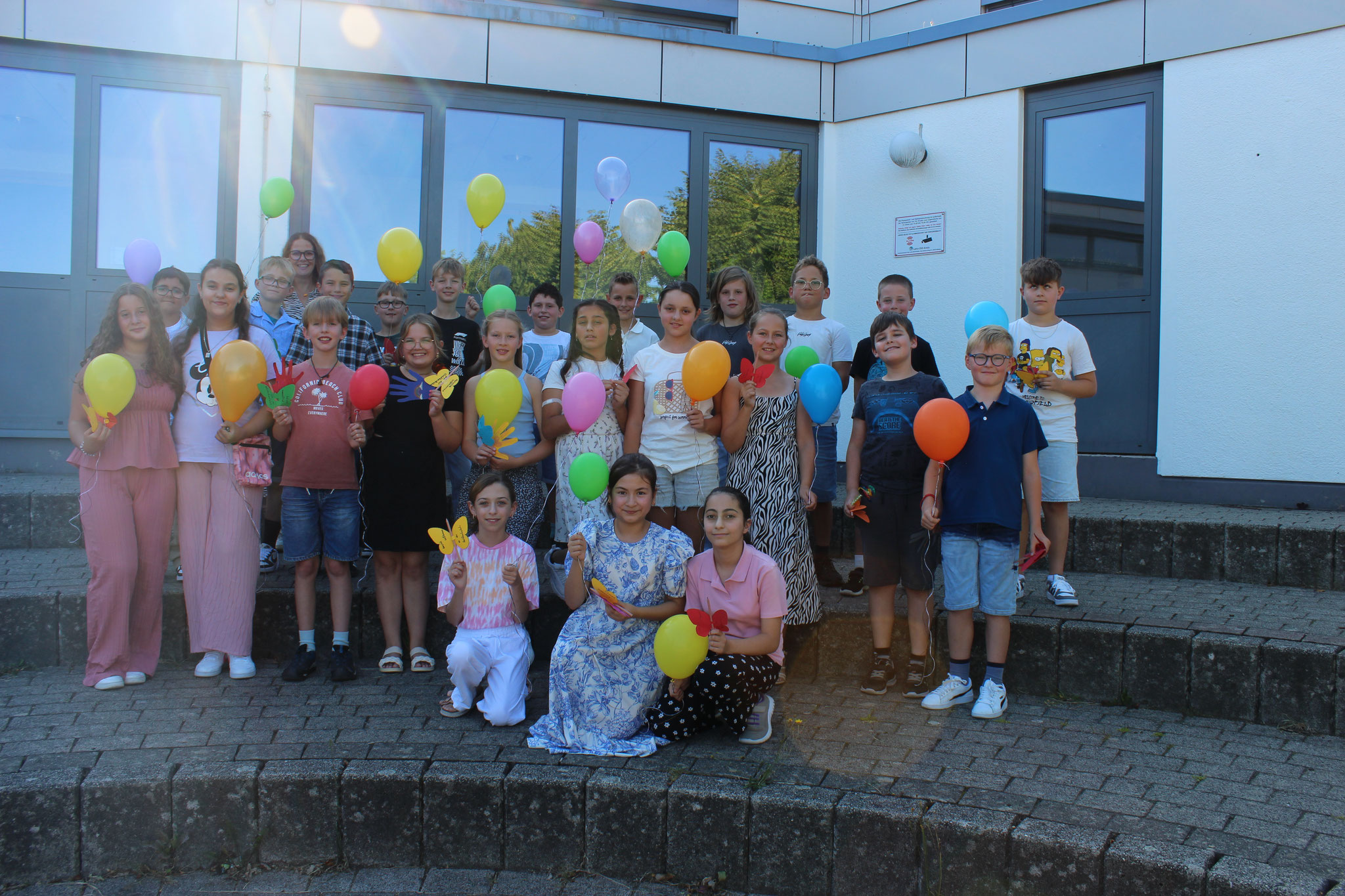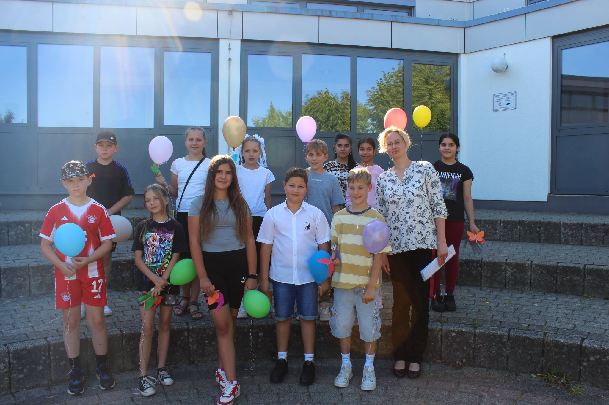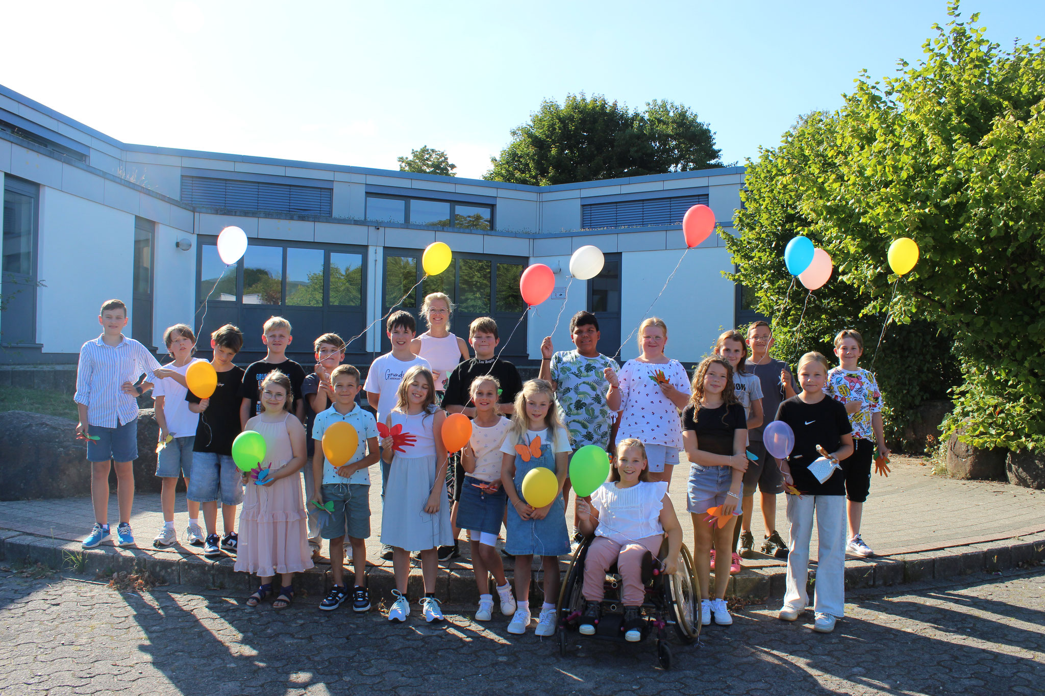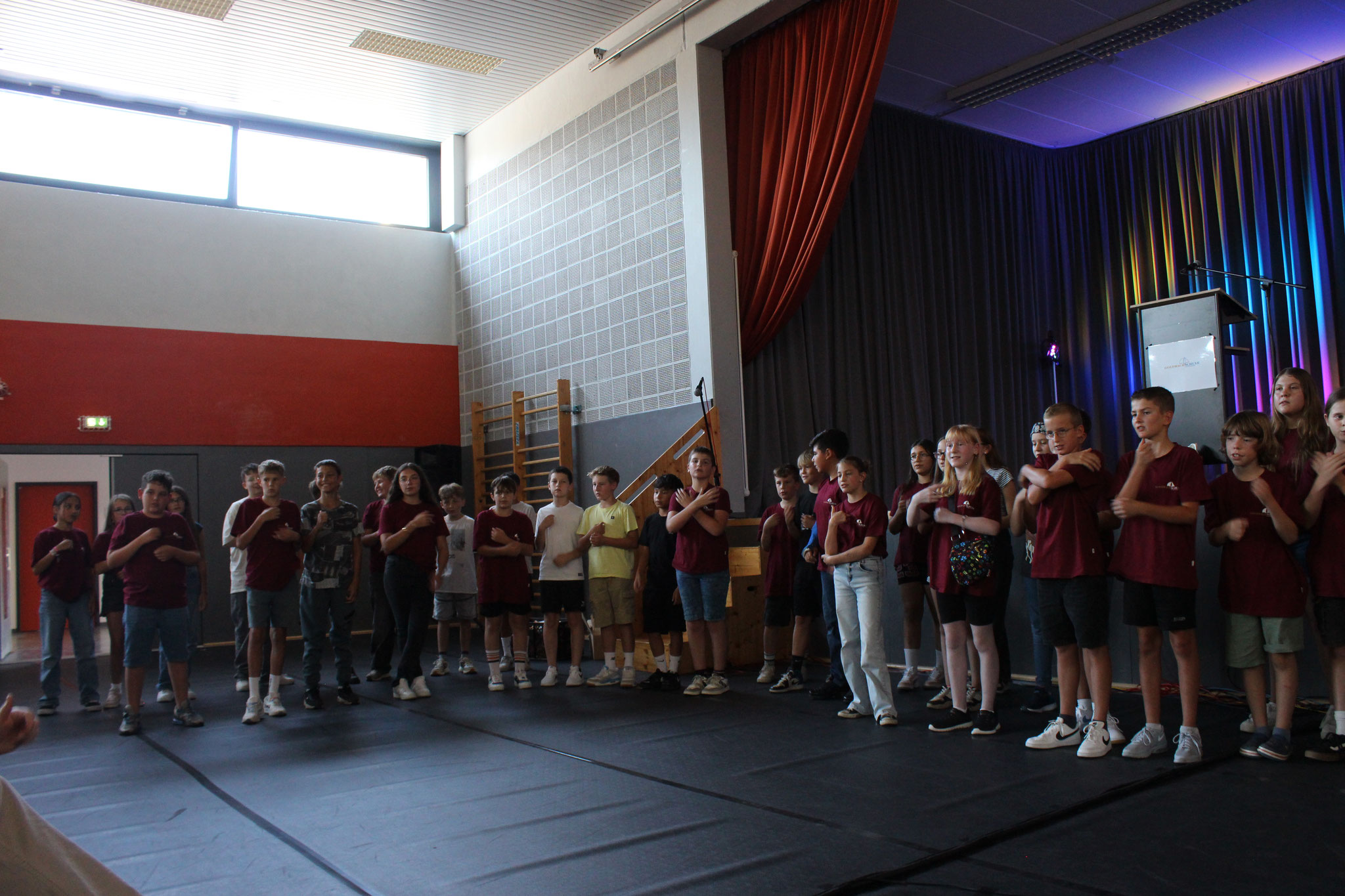 Im Anschluss an die Andacht fand dann die Einschulung der neuen Fünftklässler statt. Schulleiter Andreas Acker begrüßte die Schüler, Eltern, Lehrkräfte und alle anderen Anwesenden herzlich an der Goldbachschule. Roland Metz schloss sich den Worten an und hieß die Schüler und Eltern im Namen des Fördervereins ebenfalls willkommen. Auch in diesem Jahr wurden wieder T-Shirts, Brezel und Infomappen gesponsort. An der Gestaltung der Feierlichkeiten war zudem die jetzige Jahrgangsstufe 6 beteiligt, die ihre neuen Mitschüler mit zwei Liedern und Luftballons empfing. Nach den Beiträgen wurden die Schüler dann von ihrer jeweiligen Klassenlehrerin einzeln nach vorne gerufen, um die Geschenke des Fördervereins zu erhalten. Bevor die Schüler zum ersten Mal mit ihren Mitschülern und Klassenlehrerinnen Frau Stertz (5H), Frau Dreyße (5R1) und Frau Jost (5R2) in ihre jeweiligen Räume gegangen sind, haben alle gemeinsam auf dem Schulhof Luftballons steigen lassen.