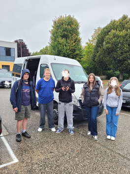 Auf dem Bild sieht man fünf Teilnehmer der AG, die abgeholt und zu Rittal gebracht werden.