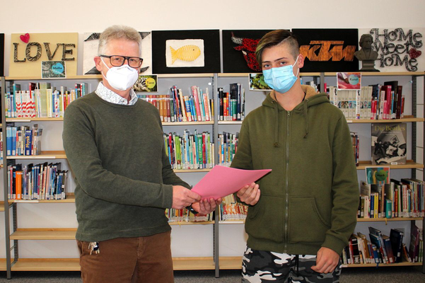 Auch dieses Mal gab es wieder erfreuliche Nachrichten für die Goldbachschule. Tom Köhler (8H) aus Manderbach erzielte das beste Ergebnis unter den Hauptschülern des Kreises und ist somit der diesjährige Kreissieger. Schulleiter Heiko Bickel gratulierte für diese herausragende Leistung. Tom darf sich über eine entsprechende Urkunde und einen Gutschein der Schule freuen.