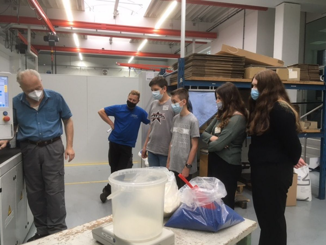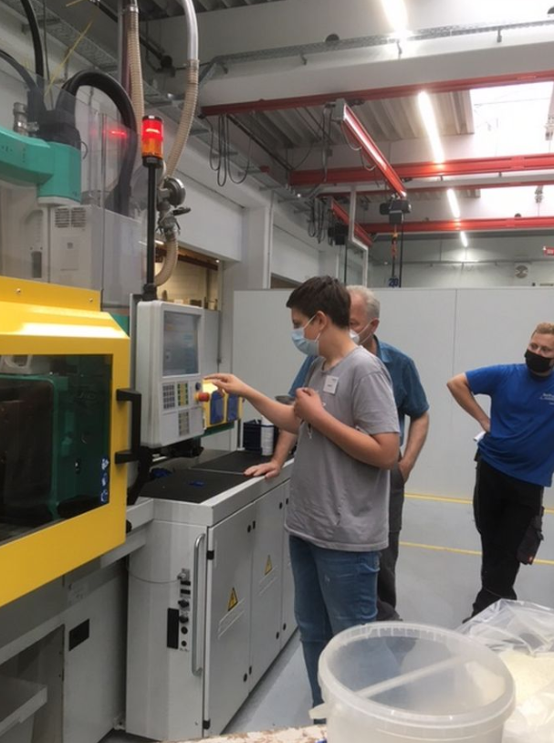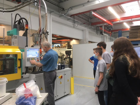 Im Anschluss an die Vorstellung des Betriebs durch Frau Wientzek (Personalabteilung) und Herrn Jacobi (Personalleitung) inklusive der 5 Ausbildungsberufe (Industriekauffrau/-mann, Kauffrau/-mann für Digitalisierungsmanagement, Fachkraft für Lagerlogistik, Verfahrensmechaniker/in im Bereich Kunststofftechnik und Werkzeugmechaniker/in im Bereich Formentechnik), durchliefen die Schüler in Gruppen, geführt von je einer/einem Auszubildenden an praxis- und handlungsorientierten Stationen, die Produktion.