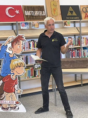 In der Mediothek las Voß mitreißend aus seinem neuesten Buch „Ben & Lasse – Agenten sitzen in der Falle“. Die Schüler folgten dem Vortrag gespannt und erhielten zusätzlich Einblicke in die Arbeit eines Kinderbuchautors. Im Anschluss erhielten interessierte Schülerinnen und Schüler Autogramme in mitgebrachte Bücher.