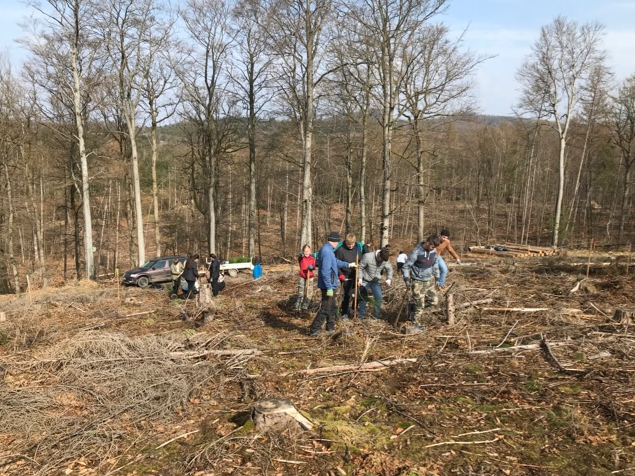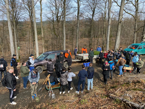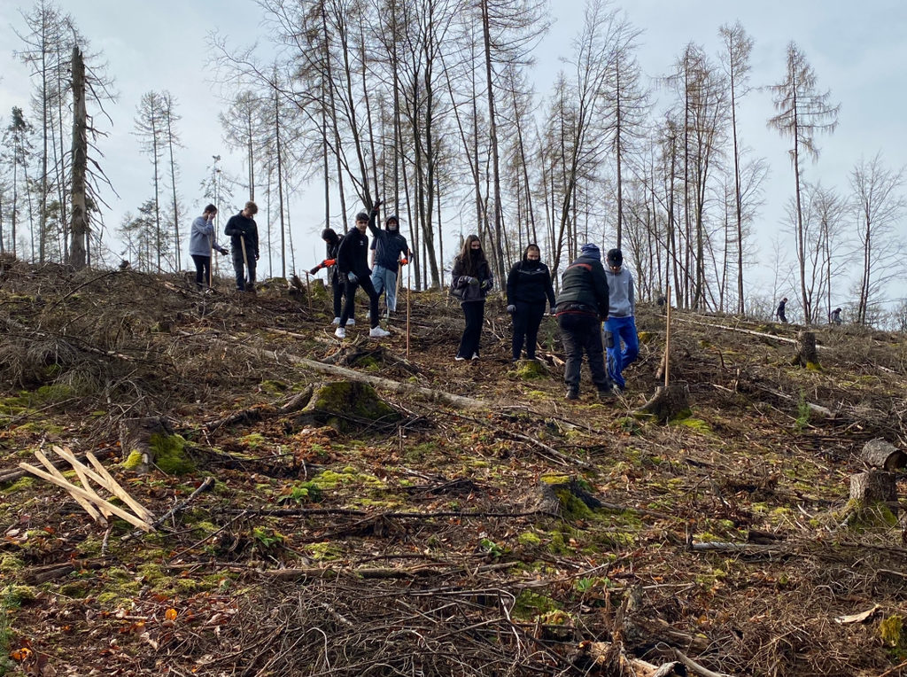 Durch den Forstwirtschaftsmeister Herrn Müller und Herrn Menges haben die Schülerinnen und Schüler eine praktische Einführung in das Pflanzen der Bäume erhalten. Im Anschluss legten die 30 Lernenden mit dem Pflanzen von 700 Douglasien los. In Kleingruppen unterteilt, wurden sie zusätzlich durch die Leiterin der Revierförsterei Struth, Frau Gerndt und durch Frau Janson aus der technischen Produktion unterstützt. Für diese Fläche liegt das Waldentwicklungsziel auf einer Mischung aus Buche, Lärche, Douglasie und zeitweise aus Fichte.