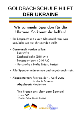 Angesichts der aktuellen Lage plant die Schülervertretung der Goldbachschule (Emilia Löwen, Celine Günther, Emelie Stoll und Daniel Tremmel) gemeinsam mit der Schülerschaft und den Lehrern/Innen eine Sammelaktion für Jugendliche in der Ukraine.
