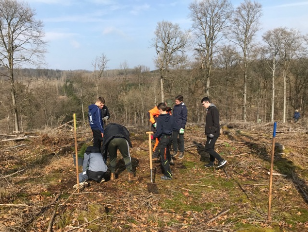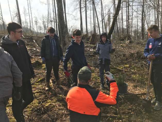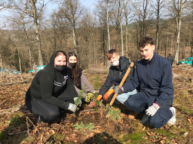 Im März fand anlässlich des Tag des Waldes eine gemeinsame Baumpflanzaktion in Kooperation mit dem HessenForst statt. Der HessenForst stellte der Schule eine Pflanzfläche in der Staatswaldabteilung 1303 A der Revierförsterei Struth, am Bomberg zur Verfügung. Hier haben die Schülerinnen und Schüler der Klasse 08R2 mit ihrer Klassenlehrerin Frau Schleifenbaum und die Klasse 09H mit ihrem Klassenlehrer Herrn Kreck den Grundstein für den Schülerwald gelegt.