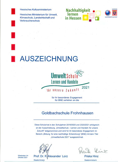 "Umweltschule - Lernen und Handeln für unsere Zukunft" ist eine Auszeichnung, die vom Hessischen Ministerium für Umwelt, Klimaschutz, Landwirtschaft und Verbraucherschutz (HMUKLV) und vom Hessischen Kultusministerium (HKM) für das besondere Engagement einer Schule im Bereich Umweltbildung und ökologische Bildung vergeben wird.