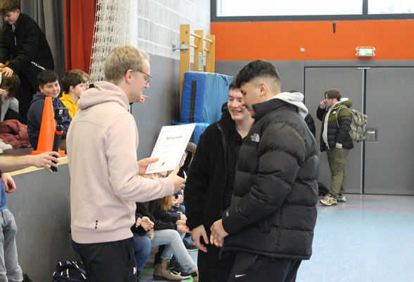 Nach sportlich fairen Spielen waren dann am Ende die Turniersieger ermittelt. Durch die Siegerehrung, moderiert von den Sportkollegen Herr Habicht und Herr Kreck, wurden die tollen Leistungen gewürdigt. Bei den Jungen 5/6 wurde die Klasse 6RH2 von Herrn Kämmerling Turniersieger, in der Jahrgangsstufe 7/8 gewann die Klasse 8H von Frau Jost und in der Jahrgangsstufe 9/10 gewann die Klasse 9H von Frau Grotegut. Bei den Mädchen gewann in der Jahrgangsstufe 5/6 die Klasse 5RH3 von Herrn Kreck neben der Klasse 6RH1 von Frau Böhm. Turniersieger in den Jahrgangstufen 7/8 wurde die Klasse 8R1 von Frau Neuburger und in der Jahrgangsstufe 9/10 die Klasse 10R2 von Frau Schwarz-Meier. Neben den Turniersiegern wurde auch die Spielerin oder der Spieler des Tages ermittelt. Bei diesem Turnier war es der Torhüter Mick aus der 9H, der das gesamte Turnier hinweg überragende Leistungen und tolle Paraden zeigte. Die Fachschaft Sport gratuliert allen Gewinnern und Teilnehmern zu den sportlich erbrachten Leistungen!