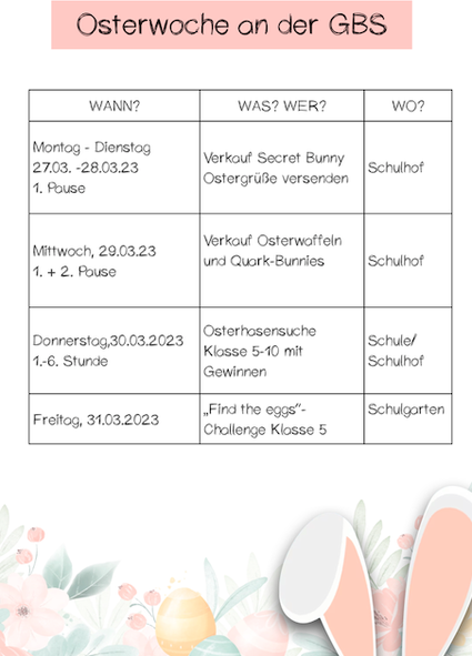 In der kommenden Woche sind im Rahmen der Osterwoche, einige Aktionen für die Schülerinnen und Schüler der Goldbachschule geplant. Die genauen Aktionen sind der Tabelle zu entnehmen. Die Goldbachschule wünscht allen Teilnehmern viel Erfolg!