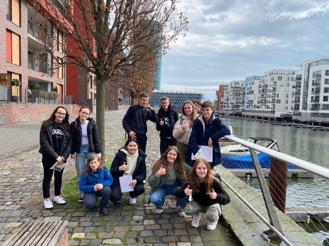 Im Rahmen des Erdkunde-Unterrichts hat die Klasse 09R2 mit ihrem Fachlehrer Fabian Kreck die Stadt Frankfurt am Main erkundet. Mit den öffentlichen Verkehrsmitteln reiste die Lerngruppe in die Metropole. Dabei sollten die im Unterricht gelernten Inhalte im Realraum vertieft und veranschaulicht werden. Gleichzeitig bekamen die Lernenden die Möglichkeit geographische Fragestellungen und Arbeitsmethoden zu erlernen, in dem sie unter anderem die Exkursionsroute kartieren mussten.