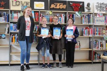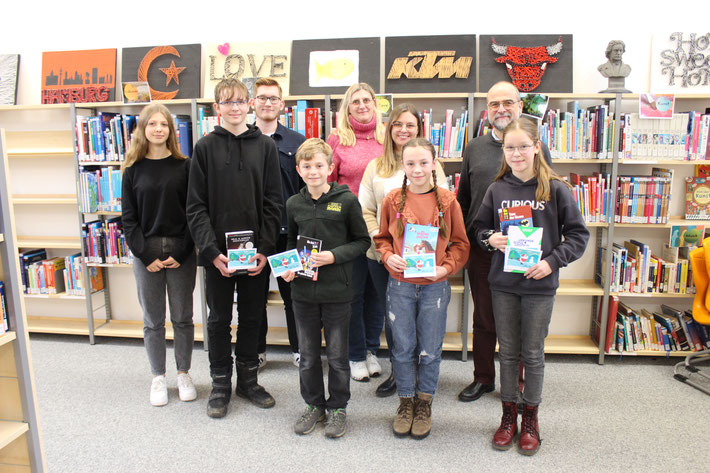 Die ausgezeichneten Leser (1. Reihe von links nach rechts) Adrijan Jacob, Leo Kammerer, Sophia Grau und Maja Kessler präsentieren stolz die vorgestellten Bücher und den Gutschein. Mit Ihnen freuen sich die Jury mit Melinda Stotz, Elias Sommerfeld, Frau Hillmann und Frau Reiss sowie der Schulleiter Herr Acker.