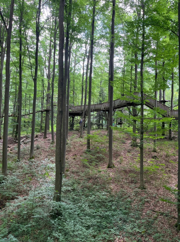 Wenn man plötzlich in 12 m Höhe vor einem Snowboard steht, mit dem man von dem einen Baum zum anderen kommen muss, oder in 10m Höhe über ein einfaches Seil balancieren muss, dann merkt man erstmal wie schwierig die Hindernisse sind. Allerdings war schnell klar, dass die Schülerinnen und Schüler die Herausforderungen annahmen und die verschiedensten Parcours mit großer Begeisterung und sportlichem Durchhaltevermögen meisterten. Durch gegenseitiges Unterstützen und Anfeuern konnte es hier und da etwas lauter in dem Waldgebiet um das Schiffenberger Kloster werden. Am Ende sind dann aber alle wieder auf festem Boden angekommen und konnten stolz auf ihre Leistungen sein. Insgesamt lässt sich festhalten, dass dieser Tag ein absoluter Erfolg war und der Zusammenhalt innerhalb der Klassen und auch übergreifend gestärkt werden konnte.